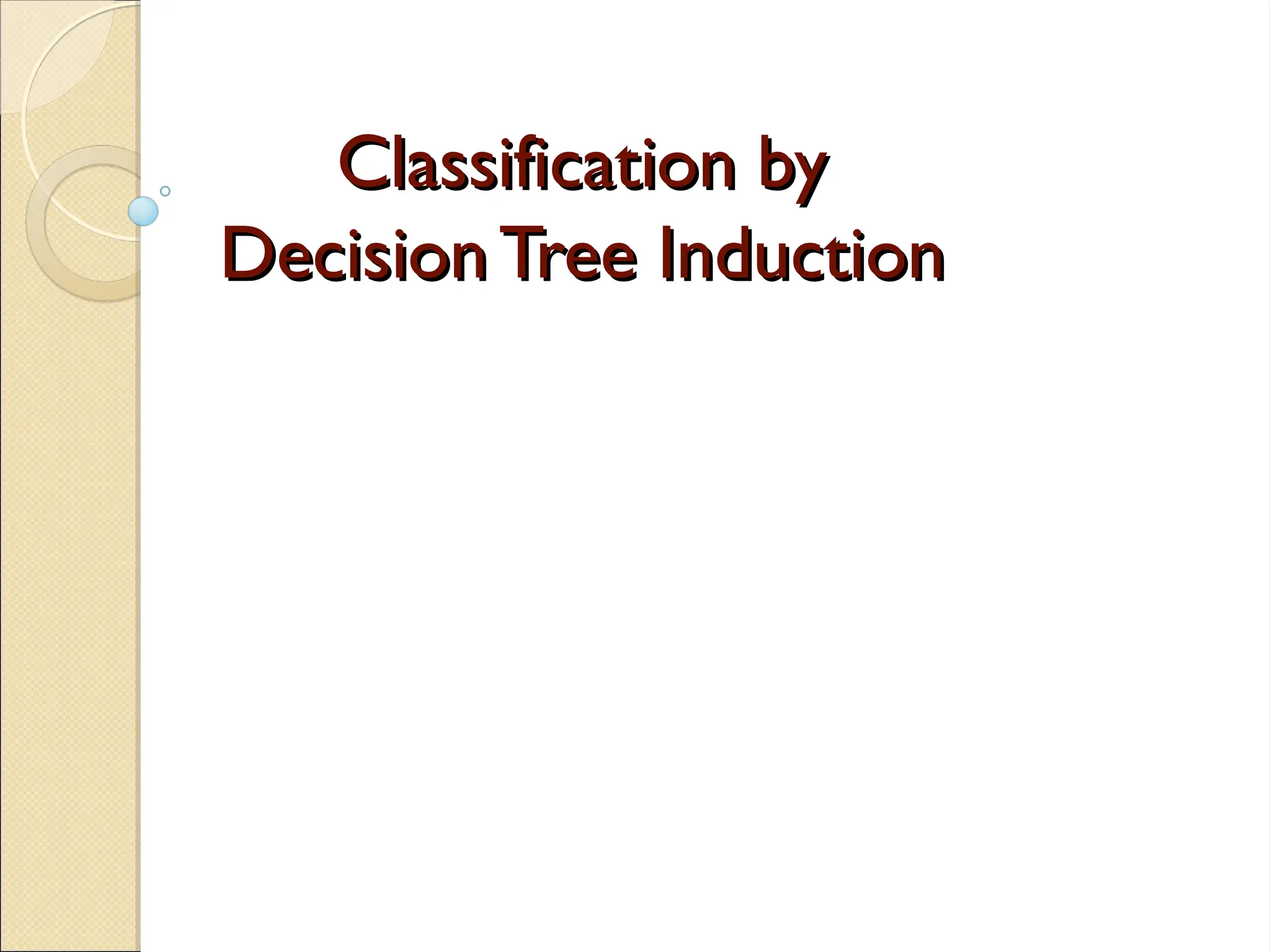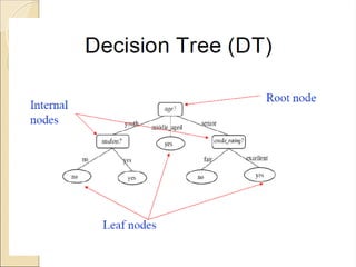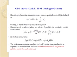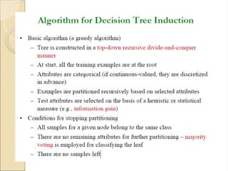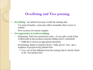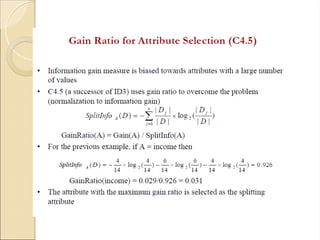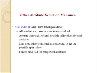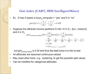 The document discusses decision tree induction, which involves creating a flowchart-like structure for classification tasks, where internal nodes test attributes and leaf nodes denote class labels. It highlights the process of selecting the best attribute for splitting training tuples using measures like information gain, gain ratio, and Gini index, with examples illustrating how to determine the splitting attribute. The final decision tree, based on attribute evaluation, predicts whether a customer is likely to purchase a computer.