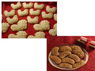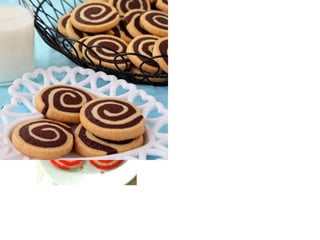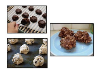 This document defines different types of cookies and provides examples of each type. It describes drop cookies as batter dropped onto a baking sheet in portions 1/2 to 1 cm thick, such as chocolate chip or oatmeal cookies. Rolled cookies contain little to no liquid or leavening and are rolled to a thin thickness from 1/8 to 3/16 inches. Bar cookies are made by spreading dough in a pan, like brownies or fruit squares. Molded cookies use a soft dough molded into balls or shapes, such as snickerdoodles or peanut butter cookies.
