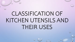 The document discusses different materials used for kitchen tools and equipment, including stainless steel, aluminum, cast iron, glass, non-stick coatings, and ceramic. It also provides details on various tools for measuring, mixing, cutting, cooking, and serving food, as well as important kitchen appliances like refrigerators, stoves, and blenders. Key tools include measuring cups and spoons, mixing bowls, knives, pots and pans, serving utensils, and equipment like ranges, microwaves, and pressure cookers.