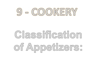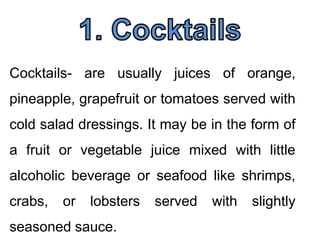 This document provides information and recipes for various types of cocktail appetizers and hors d'oeuvres, including canapés. It details the components of canapés which consist of a base, spread or topping, and garnish. Examples are provided for each component along with tips for preparing, assembling, flavor pairings and presenting canapés. Key ingredients and preparations for cocktails, hors d'oeuvres, cured meats, seafood items, cheeses, and vegetables that can be served as appetizers are also outlined.