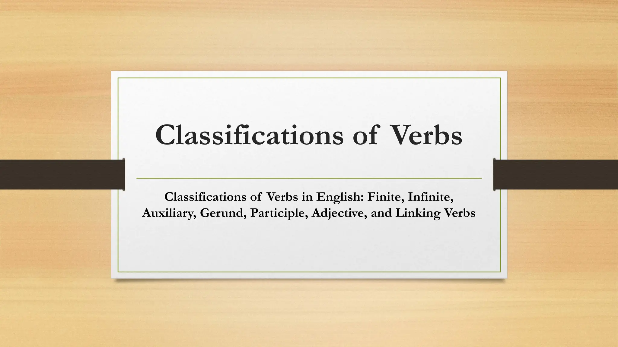 This document outlines the classifications of verbs in English, including finite, non-finite, auxiliary, gerund, participle, and linking verbs, explaining their characteristics and providing examples for each category. Finite verbs show tense and agree with their subjects, while non-finite verbs do not change form based on tense or subject. Additionally, auxiliary verbs assist main verbs, gerunds function as nouns, participles serve as adjectives, and linking verbs connect subjects to complements.