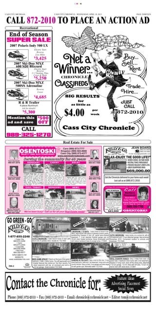 This document is a newspaper classified ad section from the Cass City Chronicle dated April 10, 2013. It includes ads for real estate rentals and sales, automotive listings, employment opportunities, and various services. There are also public notices for events like a hunter safety class and church dinners. The ads range from help wanted postings to listings for used vehicles, homes, and recreational equipment.