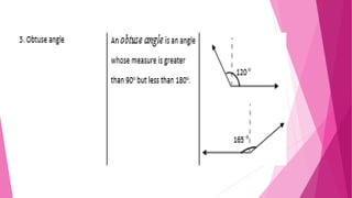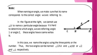 It provides examples of how angles are used in everyday situations like telling time and opening doors. It also defines angles more formally in geometry as the figure formed by two rays with a common endpoint. The document explains how angles are measured in degrees using a protractor.