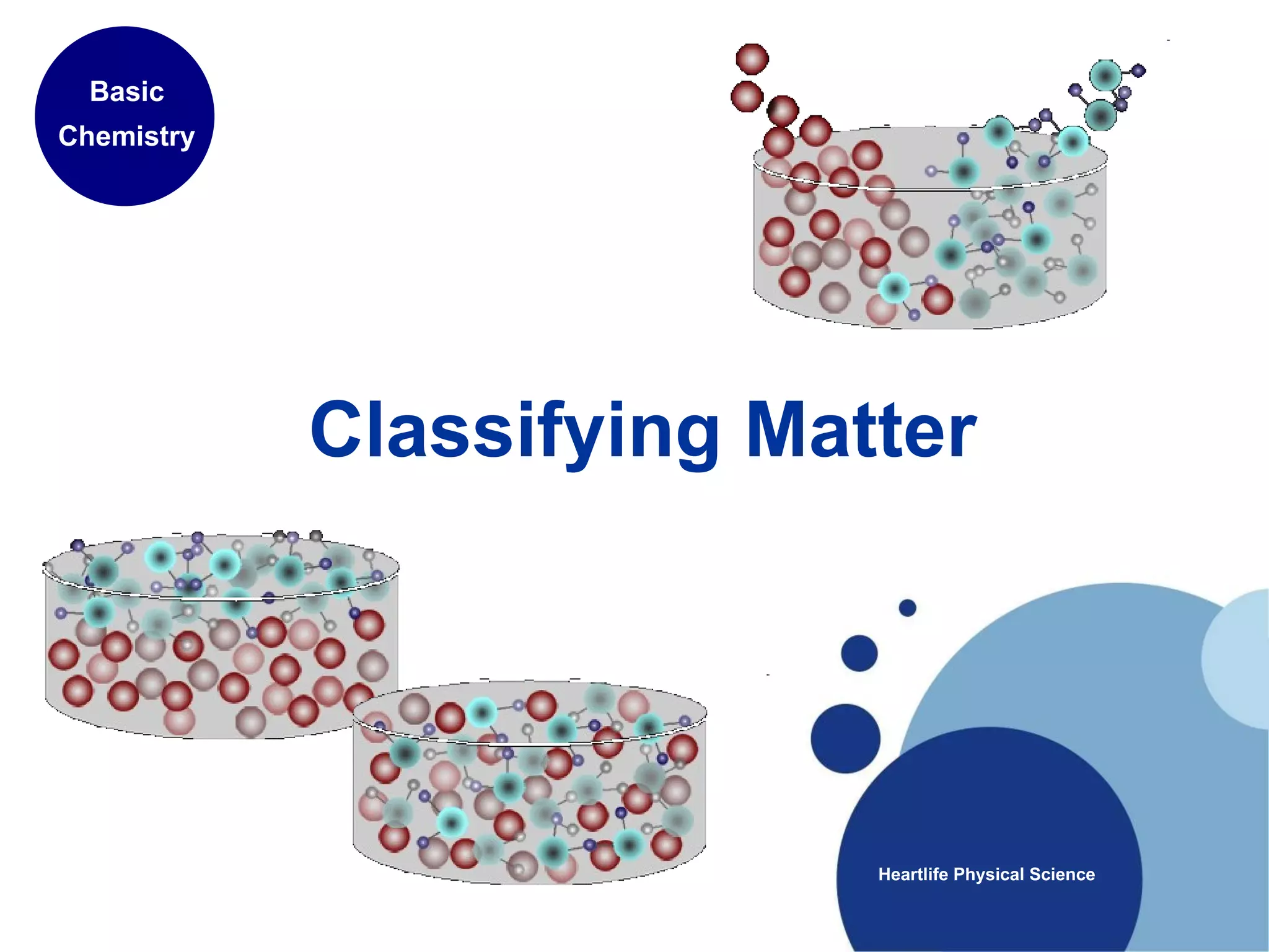 Matter is anything that has mass and takes up space. It is composed of atoms, which contain protons, neutrons, and electrons. Elements are pure substances made of only one type of atom, while compounds are made of two or more elements chemically bonded together. Mixtures contain different substances mixed together but not chemically combined. The three main states of matter are solids, liquids, and gases. Chemical and physical properties can be used to describe and identify matter.