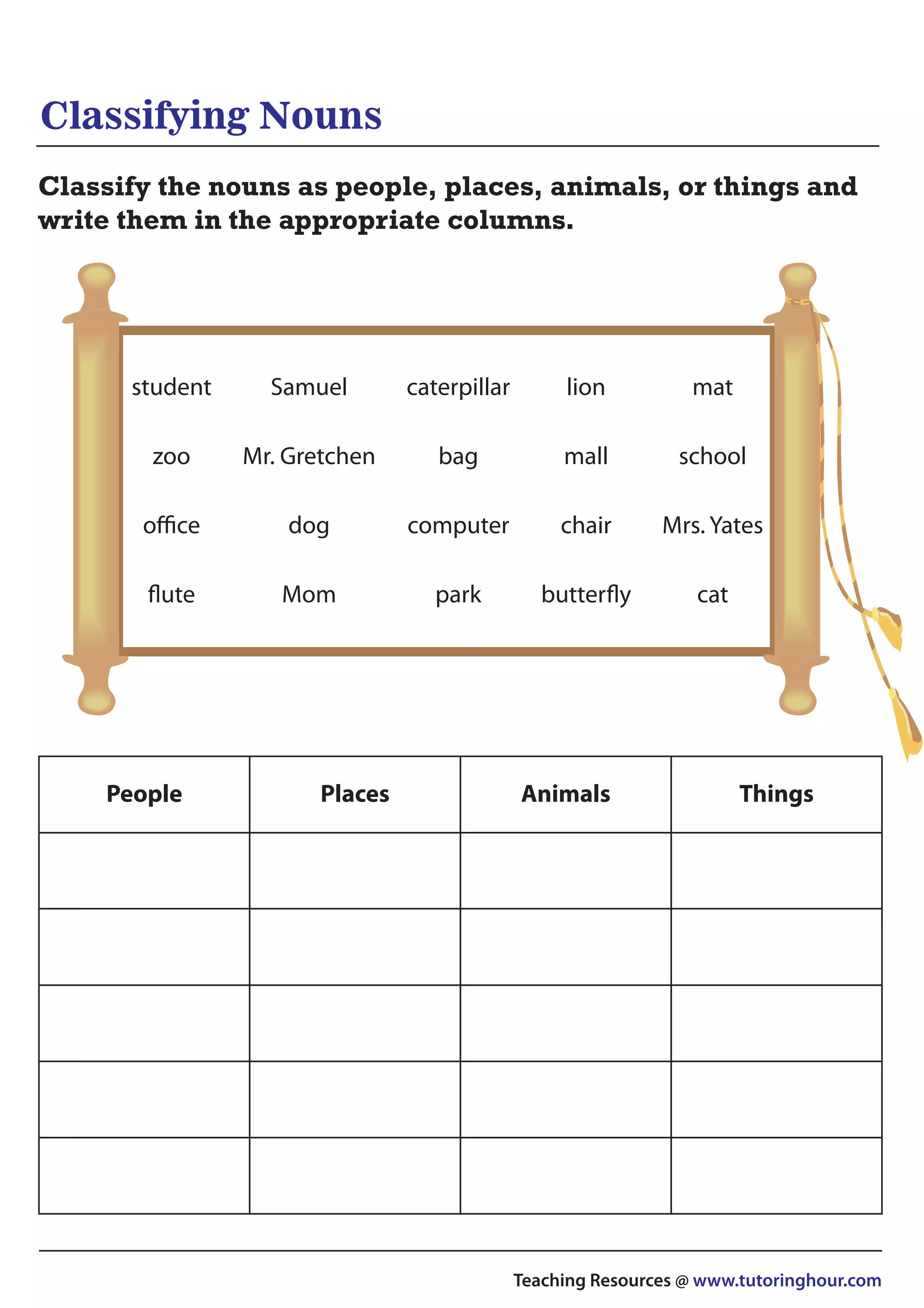 The document provides instructions to classify various nouns into categories of people, places, animals, or things. It lists examples of nouns under each column heading, including people like Mom, Mrs. Yates, and student; places such as office, park, and school; animals such as dog, butterfly, and lion; and things like computer, bag, and mat.