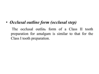 This document provides details on preparing a Class II cavity for an amalgam restoration. It describes forming an occlusal outline similar to a Class I cavity, with the proximal box extending to include all caries up to 0.5mm below the adjacent surface. Resistance form is created through flat pulpal and gingival walls, conserving tooth structure in cusps and ridges. Retention is provided through dovetail shaping in the distal pit and adding proximal locks in dentin as needed. Finishing involves a slight cavosurface bevel and enhancing secondary resistance and retention through convergence of walls and dovetail designs.