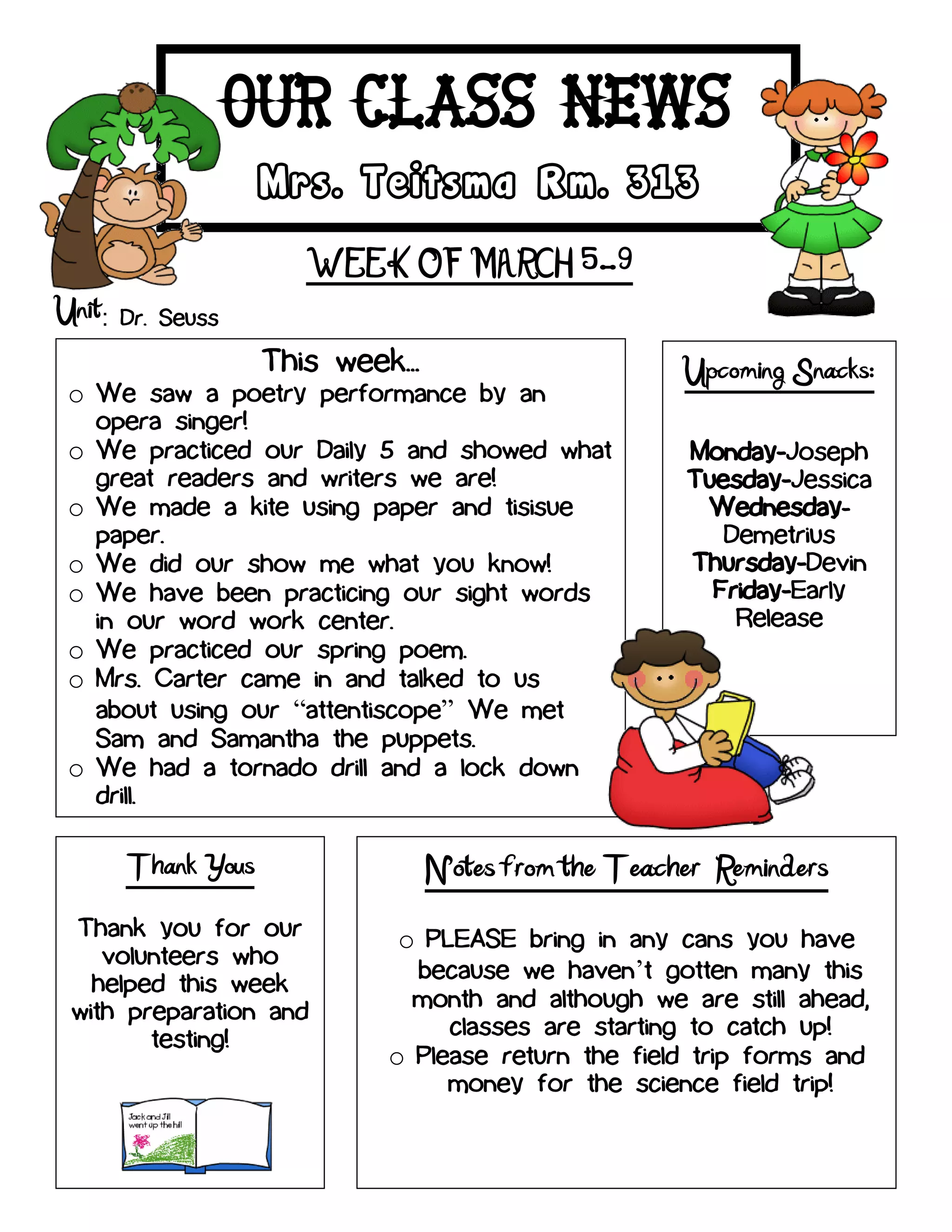 This weekly classroom newsletter from Mrs. Teitsma's Room 313 provides information about the past week's activities and upcoming events. The class saw a poetry performance, practiced literacy skills, made kites, reviewed sight words, and participated in tornado and lockdown drills. Upcoming snacks are also noted, as are thank yous to volunteers and reminders about collecting cans for a drive and returning permission slips for a science field trip.