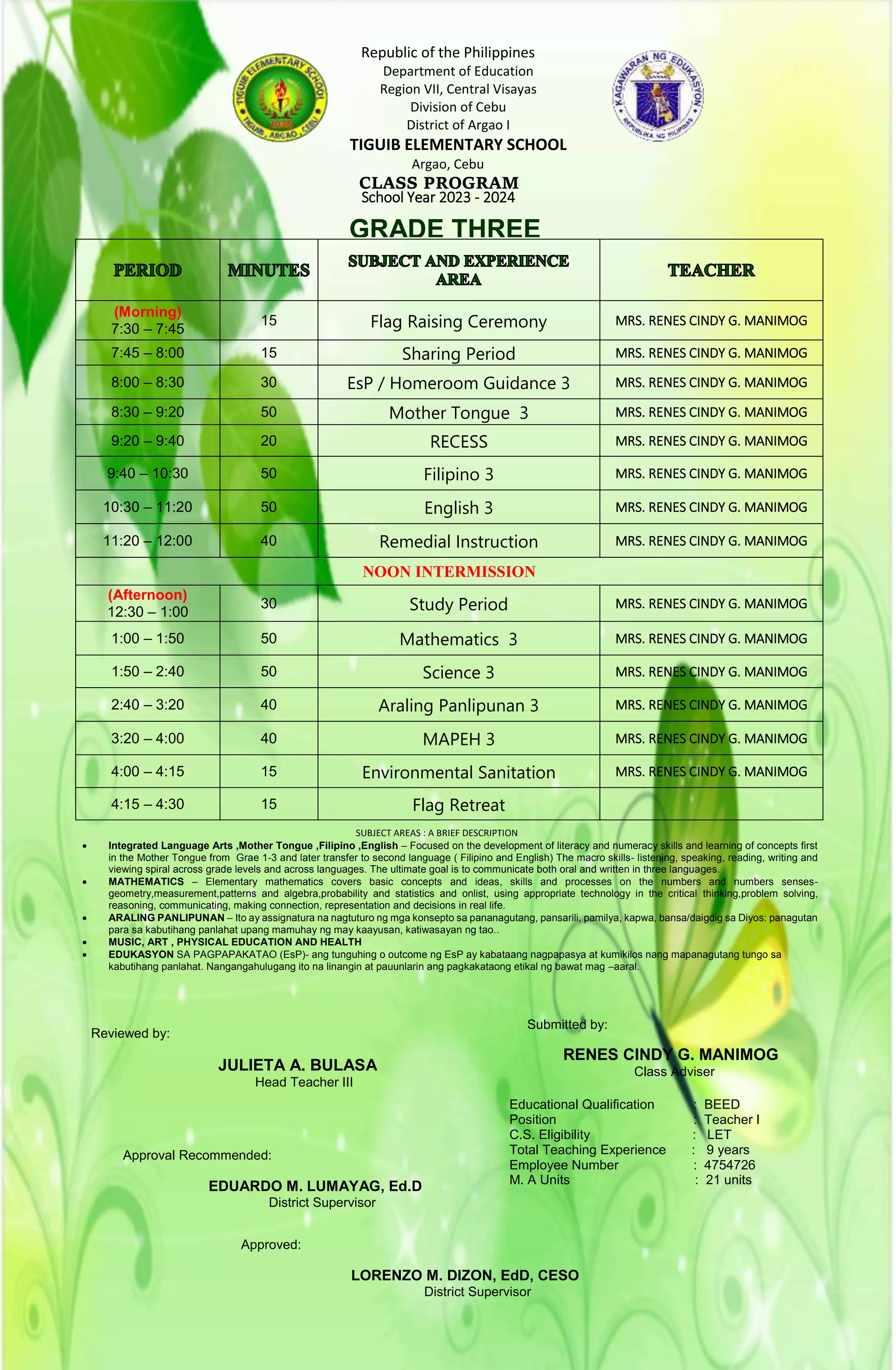 This document outlines the daily class schedule and subject areas for Grade 3 students at Tigui Elementary School in Argao, Cebu, Philippines. The schedule shows the times, subjects, and teachers for the morning and afternoon sessions. Key subjects include Integrated Language Arts, Mother Tongue, Filipino, English, Mathematics, Araling Panlipunan, Music/Art/Physical Education/Health, and Edukasyon sa Pagpapakatao. Subject areas are briefly described with their goals of developing literacy, numeracy, social studies concepts, and ethical decision making skills. The program was submitted by the class adviser and approved by the district supervisors.