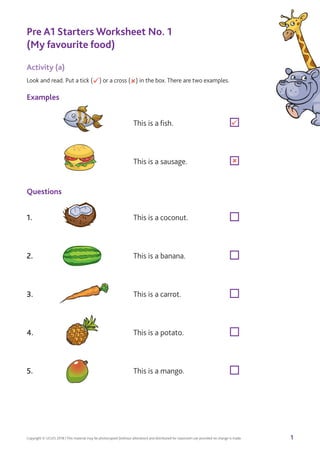 This document contains worksheets and classroom activities for young English language learners at the Pre A1 level. The activities practice vocabulary related to topics like food, school, animals, clothes and colors. Learners look at pictures and read short texts to complete matching, ordering and cloze exercises. They also do speaking, writing and drawing activities to reinforce new vocabulary. The worksheets provide structured practice in basic English skills.