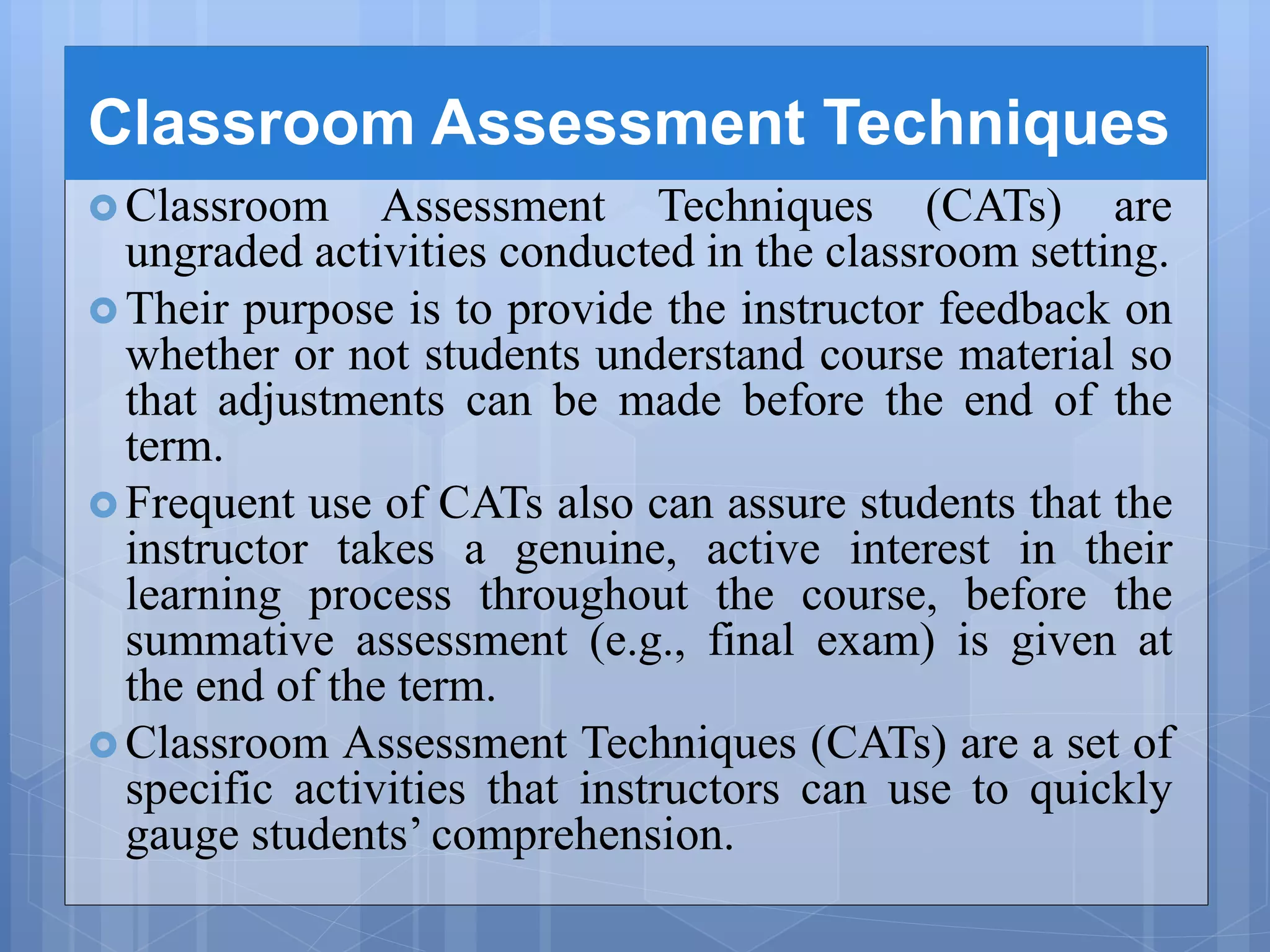 Classroom Assessment Techniques (CATs) are ungraded activities conducted in class to provide instructors feedback on student understanding before exams. CATs include techniques like minute papers, one-sentence summaries, and application cards that assess comprehension without grades. The feedback informs instructors to adjust pacing or address confusion to improve learning outcomes.
