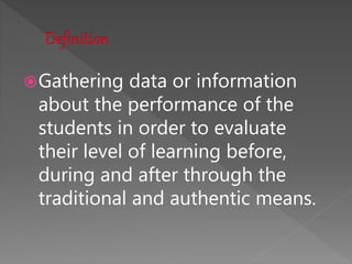 This document discusses gathering student performance data through traditional and authentic means before, during, and after instruction to evaluate learning levels formatively and summatively. The data can then be used to track student progress, determine if interventions are needed, and evaluate the effectiveness of instructional strategies.