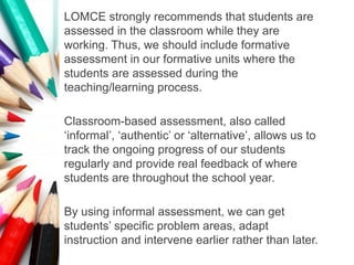 This document discusses classroom-based assessment and recommends incorporating formative assessment into teaching units to evaluate student progress. Classroom-based assessment, also called informal assessment, allows teachers to regularly track student progress throughout the school year and provide feedback. In order for assessment to be practical, it needs to easily adapt to classroom methodology. The document then provides examples of classroom-based assessments for listening, speaking, reading and writing skills that are recommended for informally evaluating students.