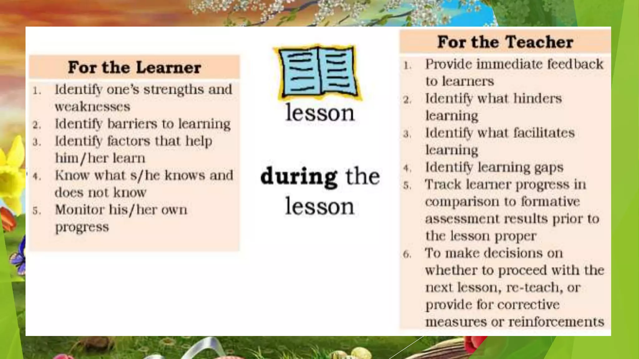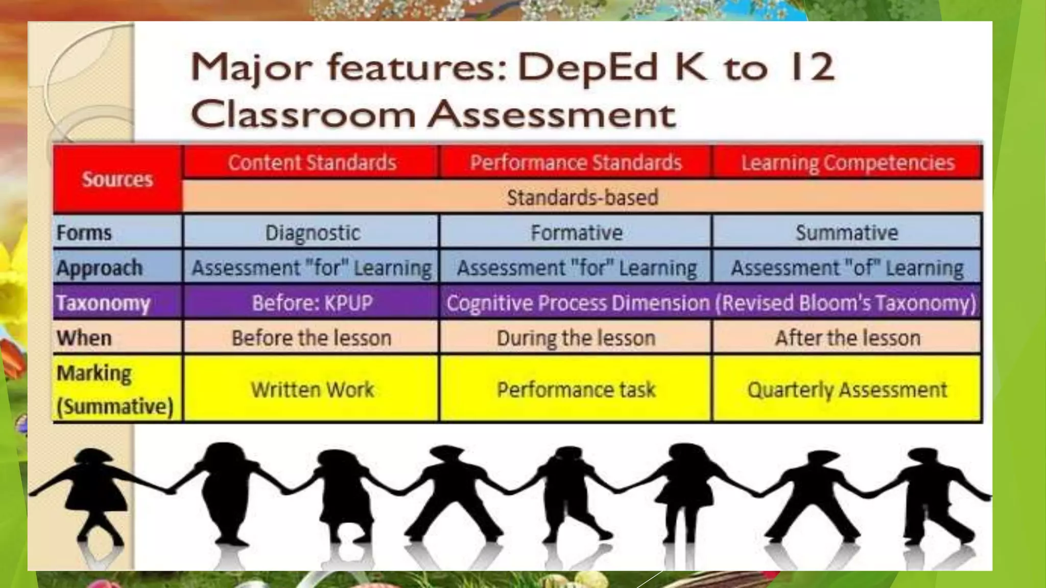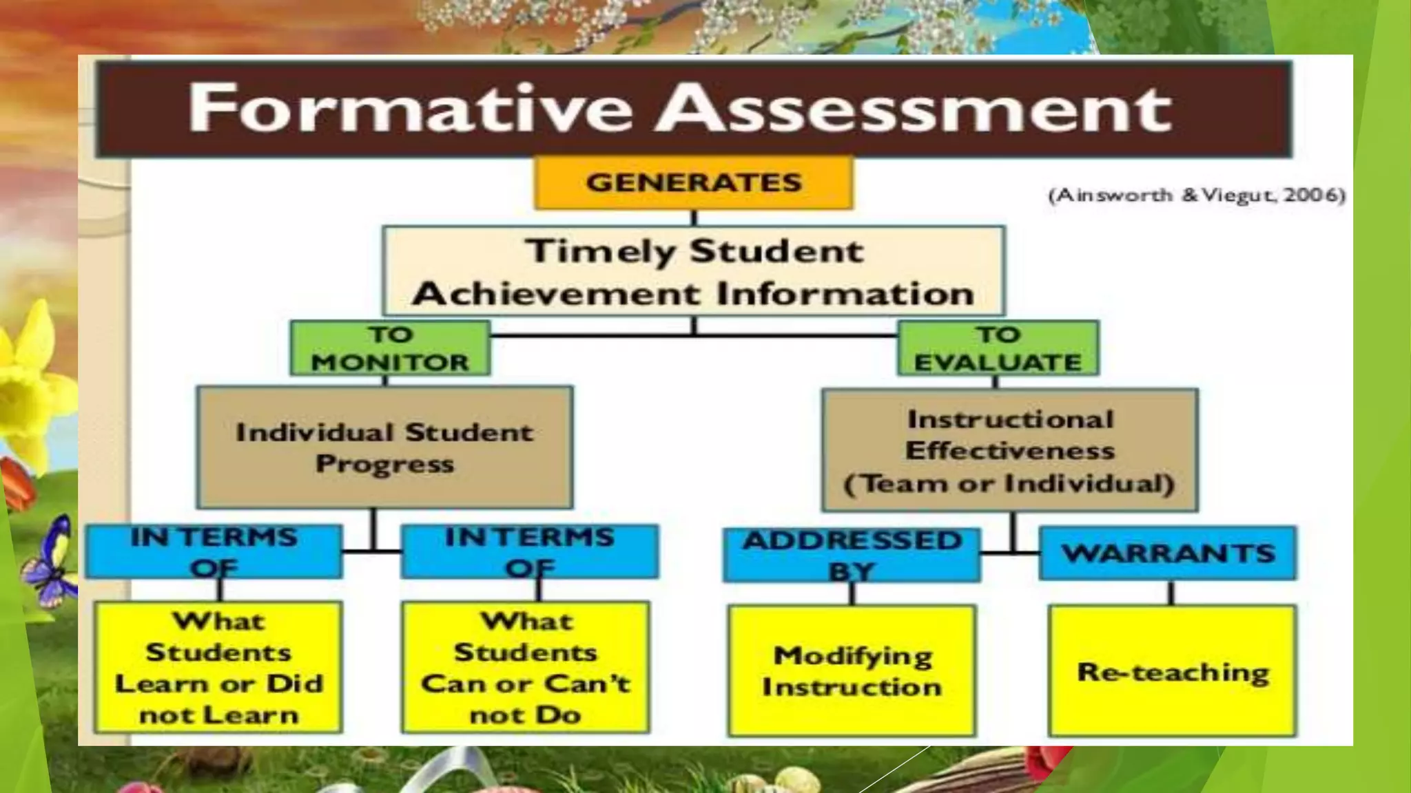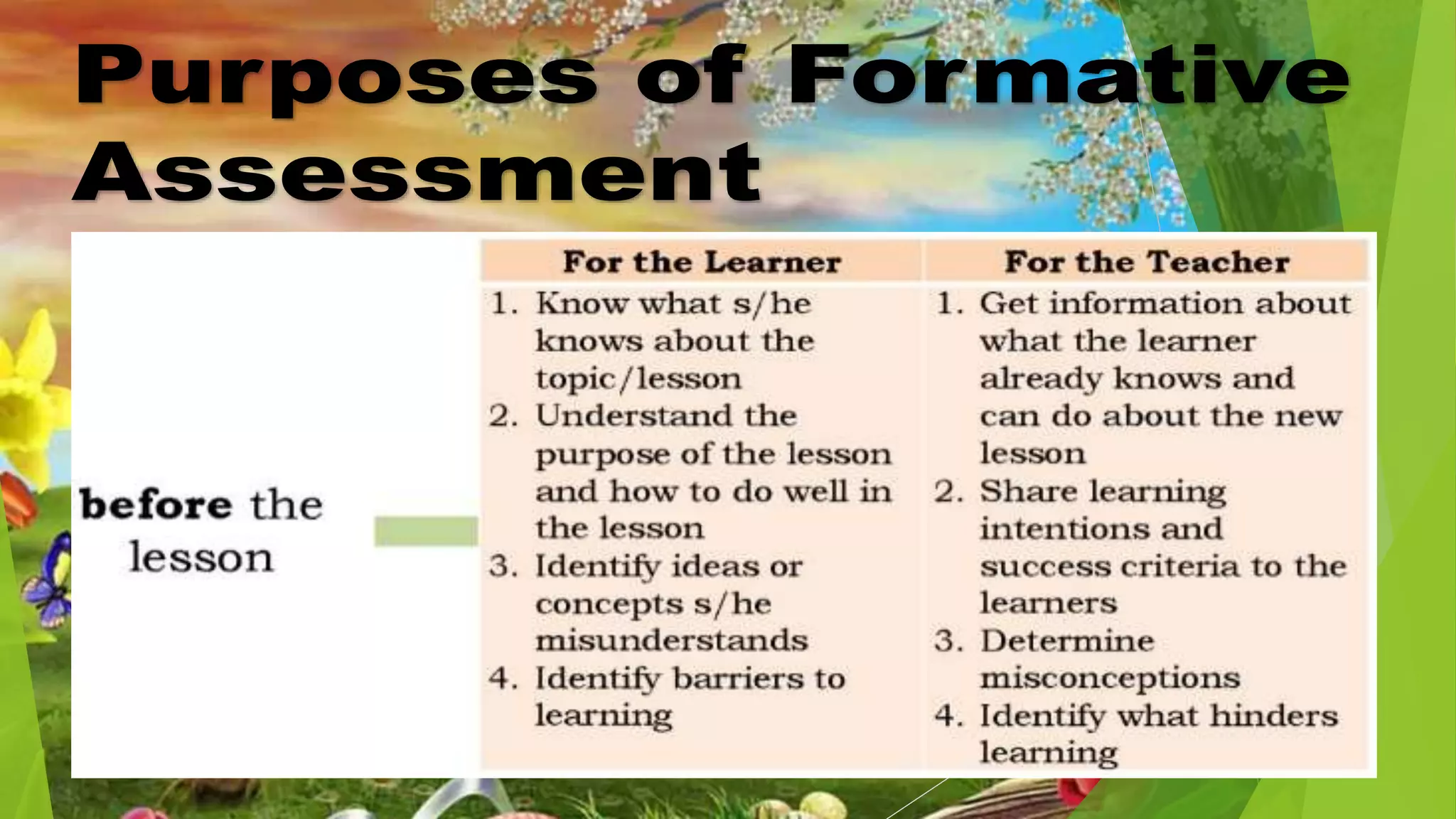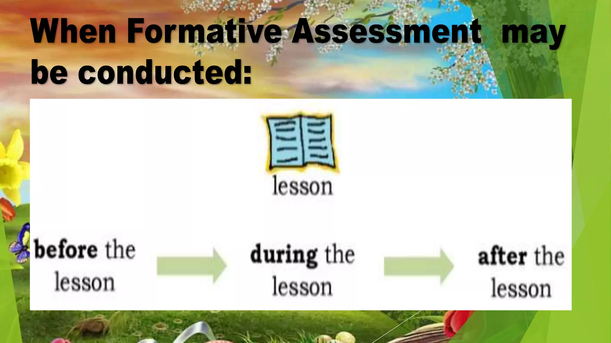 This document discusses classroom-based assessment tools. It defines classroom assessment as a process of identifying, gathering, organizing and interpreting information about what learners know and can do. The document lists different types of assessment tools used in the classroom, including quizzes, tests, essays, demonstrations, presentations, and performance-based assessments. It distinguishes between formative and summative assessment, noting that formative assessment is used to help students improve their learning, while summative assessment occurs at the end of a learning period to measure student achievement. The key goal of assessment is to use the information gathered to provide remediation, enrichment, or reinforcement activities to help students perform better.
