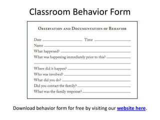 Download our classroom behavior forms for free to document your classroom behavior - http://www.positiveclassroombehavior.com/classroom-behavior-forms/