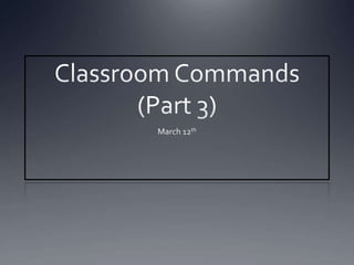 This document lists common classroom commands in Japanese such as "Please write", "Please read", "Please look", "Please listen", "Please stand", "Please turn in", "Please show me", "Please open the window", "Please close the door", "Please be quiet", and "Well done". Each command is written in Japanese hiragana followed by the English translation and repeated again for emphasis.