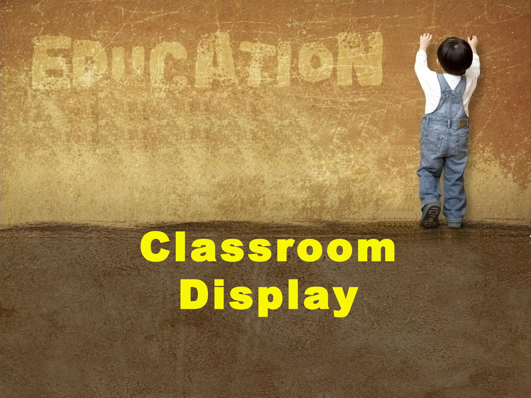 The document provides tips and guidelines for creating effective classroom displays. It discusses the purposes of displays, including to enrich lessons, provide extra information for students, and showcase student work. It also offers advice on display surfaces, layout, organization, and design elements like color schemes, captions, and maintaining displays. The overall message is that classroom displays should be well-planned, organized, engaging, and celebrate student effort and learning.