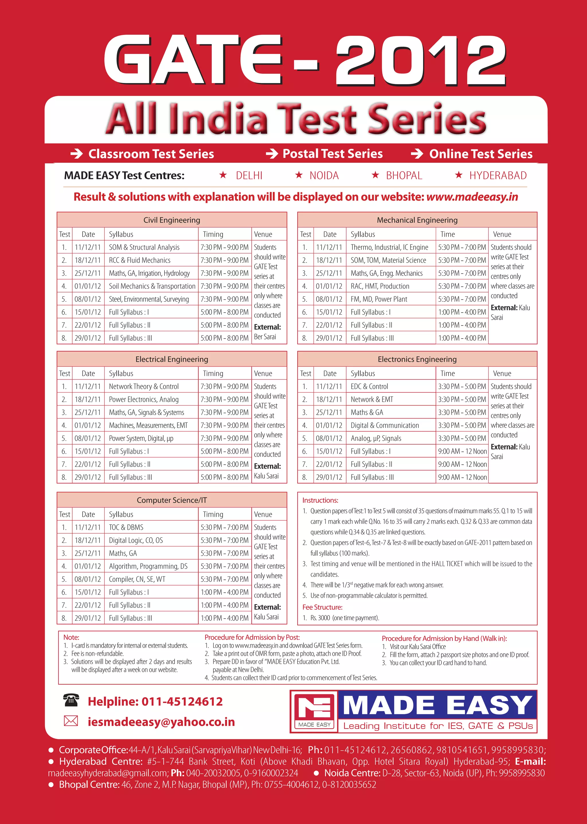 The document provides details of the 2012 All India Test Series being conducted by Made Easy for various engineering disciplines including Civil, Mechanical, Electrical, Electronics, and Computer Science. There will be 8 tests from 11th December 2011 to 29th January 2012 covering the full syllabus, with tests 1-5 focusing on specific topics. The tests will be held at various centers in Delhi, Noida, Bhopal, and Hyderabad. Students can enroll for the classroom, postal, or online test series, with the fee being Rs. 3000. Admissions can be done online or by visiting the Kalu Sarai office in Delhi.