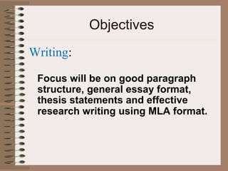 This document outlines the objectives and expectations for Mr. Ulmer's sophomore English class. The class will focus on improving writing skills like paragraph structure, essays, thesis statements, and MLA research papers. Students will also read and analyze various short stories, poetry, drama, and novels. Everyone will have opportunities to present individually and collaboratively in speech assignments. Grammar, usage, and vocabulary will be addressed when editing writings, with vocabulary coming from class readings. Grades are based on the total points earned divided by possible points. Students are responsible for keeping up with classwork and can check progress on HomeLogic weekly. Proper classroom behavior involves being prompt, prepared, polite, and positive. Students and parents can stay informed through
