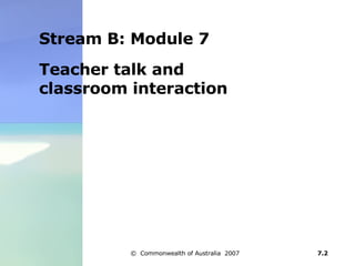 This module discusses the importance of interaction in language classrooms. It notes that student talk typically accounts for less than 30% of classroom talk. Studies show that students learn language through asking questions. However, student questioning drops off when formal schooling begins. The module considers different types of interactions in the classroom, including between teacher-student and student-student. It also addresses the goals of classroom interaction and using both the target language and students' first language to support learning. Teachers are encouraged to reflect on interaction in their own classrooms.