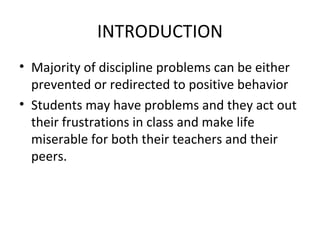 The document discusses classroom interventions for chronic behavior problems, emphasizing the importance of building relationships and helping students gain self-control rather than solely using punishment. Effective strategies include self-monitoring, anecdotal record keeping, functional behavior assessments, and behavior contracts aimed at improving student behavior through positive reinforcement and goal tracking. Teachers are encouraged to foster a sense of belonging and competence in students by creating supportive classroom environments and offering constructive feedback.