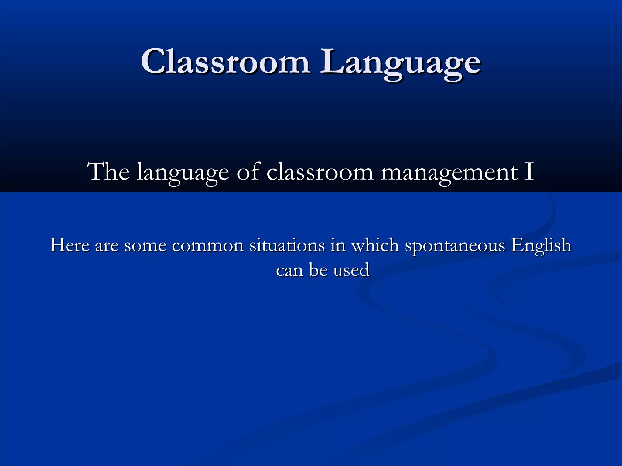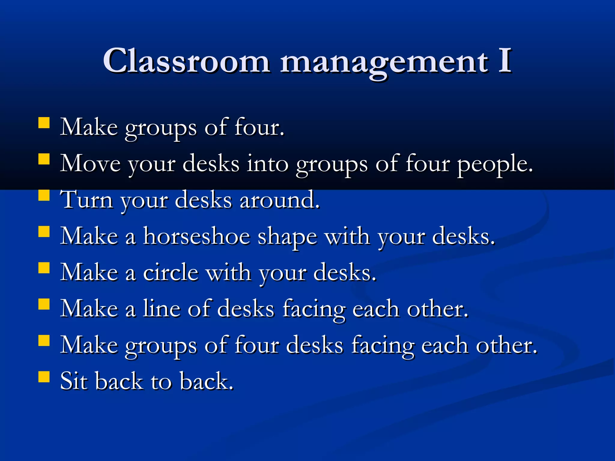 The document provides examples of language that teachers can use for classroom management. It includes phrases for organizing students into groups of different sizes, having them work individually or together, checking if they have finished an activity, and moving on to the next one. Some key phrases mentioned are "make groups of four", "work in pairs/threes/fours/fives", "have you finished?", and "do the next activity". The language examples given are intended to help teachers effectively manage classroom activities and student participation.