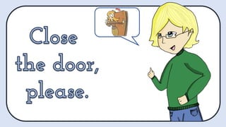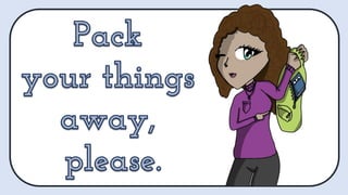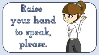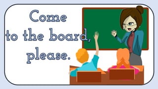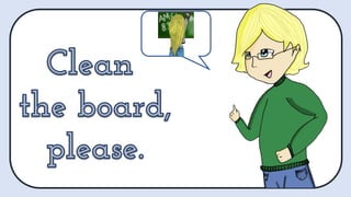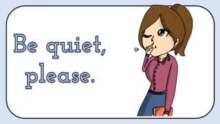 This document contains a collection of common classroom phrases and questions in English. It includes requests to enter the classroom, ask questions, borrow supplies, go to the bathroom, pronounce words, repeat instructions, and other interactions between students and teachers. The purpose seems to be to provide English language learners with essential classroom language.