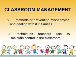 The document provides insights into effective classroom management strategies, emphasizing the importance of maintaining control to enhance student success. Key components include comprehensive induction processes, crucial elements of effective teaching, and principles for managing behavior effectively. It highlights the significance of proactive discipline, positive reinforcement, and organizational strategies to create a conducive learning environment.