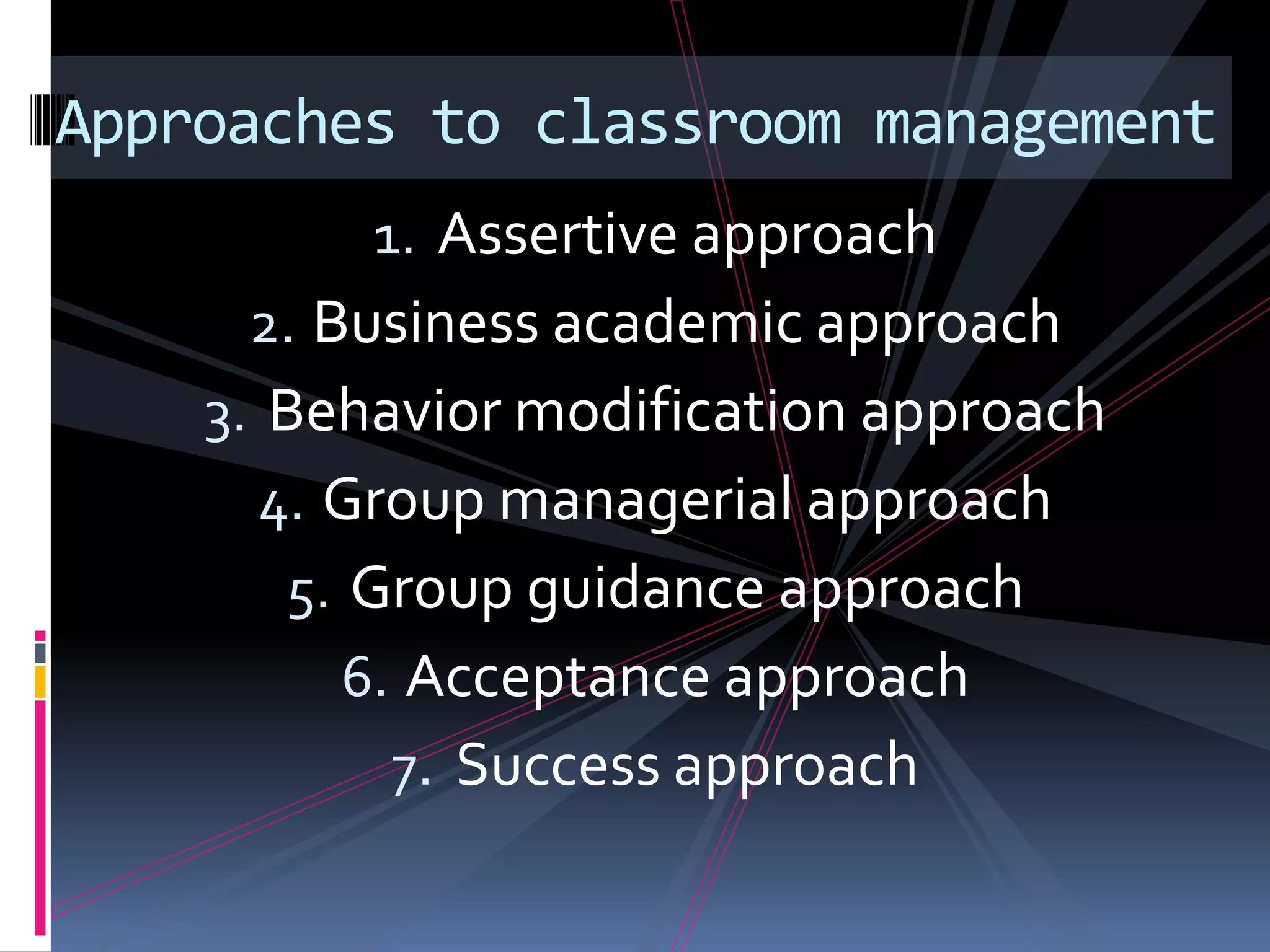 Classroom management involves addressing issues related to student discipline, teaching techniques, supplies, classroom environment, and student relationships. There are several approaches to classroom management including assertive, business academic, behavior modification, group managerial, group guidance, acceptance, and success approaches. The assertive approach involves clearly communicating rules and consequences. The behavior modification approach uses reinforcement and consequences to modify behavior. The group managerial approach aims to quickly address inappropriate group behavior. Effective classroom management also requires preventing problems through planned activities, rules, routines, and monitoring of students.