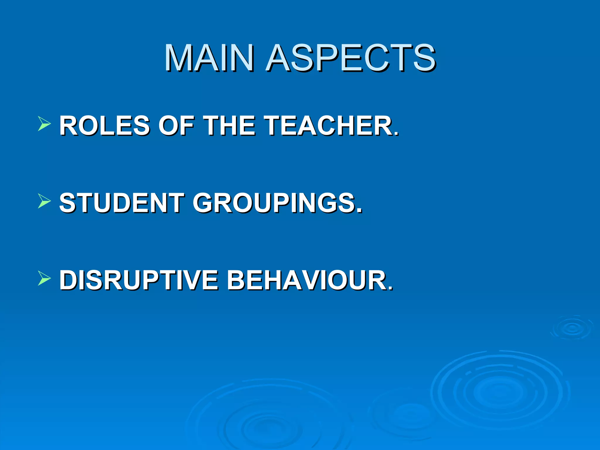 This document discusses key aspects of classroom management including the teacher's roles, student groupings, and disruptive behavior. It describes the teacher as a controller, assessor, organizer, and having other roles like prompter, participant, and tutor. It discusses different student groupings like lockstep, pair work, and individual work and their benefits and drawbacks. The teacher must take on different roles and utilize various student groupings to effectively manage the classroom.
