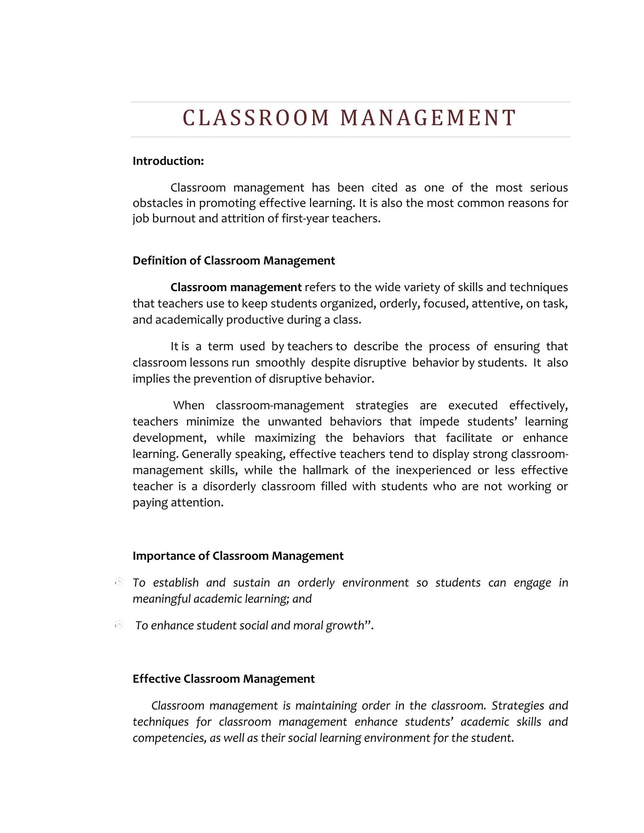 Classroom management is essential for effective learning and reducing teacher burnout, involving diverse strategies to keep students organized and focused. Effective management includes establishing rapport, setting clear rules, maintaining mobility, using non-verbal cues, and offering rewards, while avoiding public discipline and emotional loss of control. By fostering an orderly environment, teachers can enhance academic and social outcomes for their students.