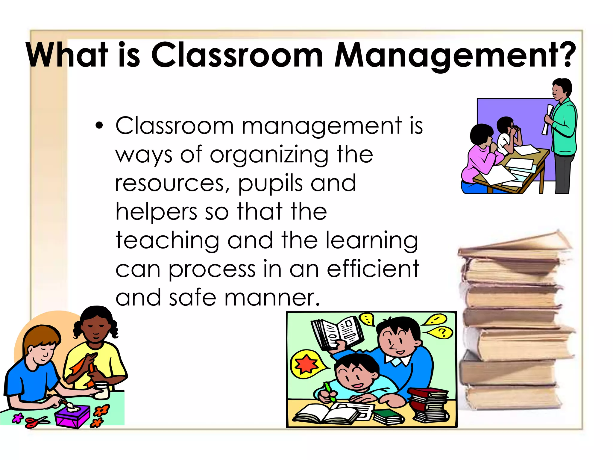 Classroom management involves organizing students, teachers, and resources to ensure efficient and safe teaching and learning. It is important because teacher satisfaction depends on student cooperation, and classroom management is a primary concern for new teachers. There are various seating arrangements and student groupings that can be used, including rows, circles, separate tables, whole-class, individual work, and small groups. Effective classroom management requires consideration of various factors when deciding student groupings and seating, using different techniques for introducing, conducting, and providing feedback for group work, and troubleshooting potential issues.