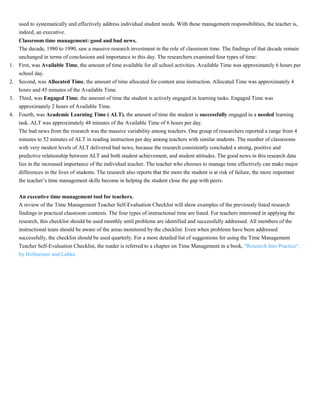 4) Academic learning time (ALT), which is when students are successfully engaged in and learning from instructional activities. The document emphasizes that effective classroom management aims to maximize ALT.