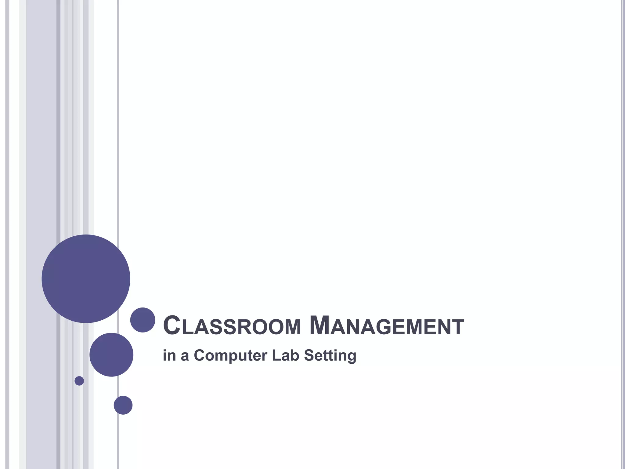 The document provides tips for effectively managing a classroom in a computer lab setting such as having backup plans, engaging students with interesting assignments, clearly explaining expectations for behavior and equipment use, monitoring students closely, and addressing any issues immediately. Teachers are advised to be prepared with alternate activities, enforce rules to prevent damage to equipment, and not allow students to distract or bully the teacher.