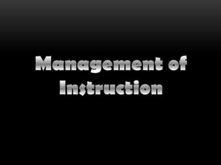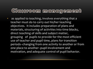 Classroom management involves everything a teacher must do to carry out their objectives, including planning, instructional delivery, grouping students, and maintaining student behavior. It should be based on educational research and focus on building positive relationships and engaging instructional methods to facilitate learning. Comprehensive classroom management establishes behavioral standards through collaborative processes and employs a variety of techniques to address inappropriate behavior. Effective classroom management maximizes instructional and academic learning time.