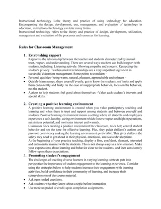 Classroom management refers to the wide variety of skills and techniques teachers use to maintain an orderly learning environment where students are focused, on task, and productive. Effective classroom management involves preventing disruptions, responding appropriately to issues, and establishing a positive classroom culture with clear expectations and rules. It is important for teachers to build rapport with students, create an engaging learning environment, and implement behavior policies and discipline strategies to promote learning.