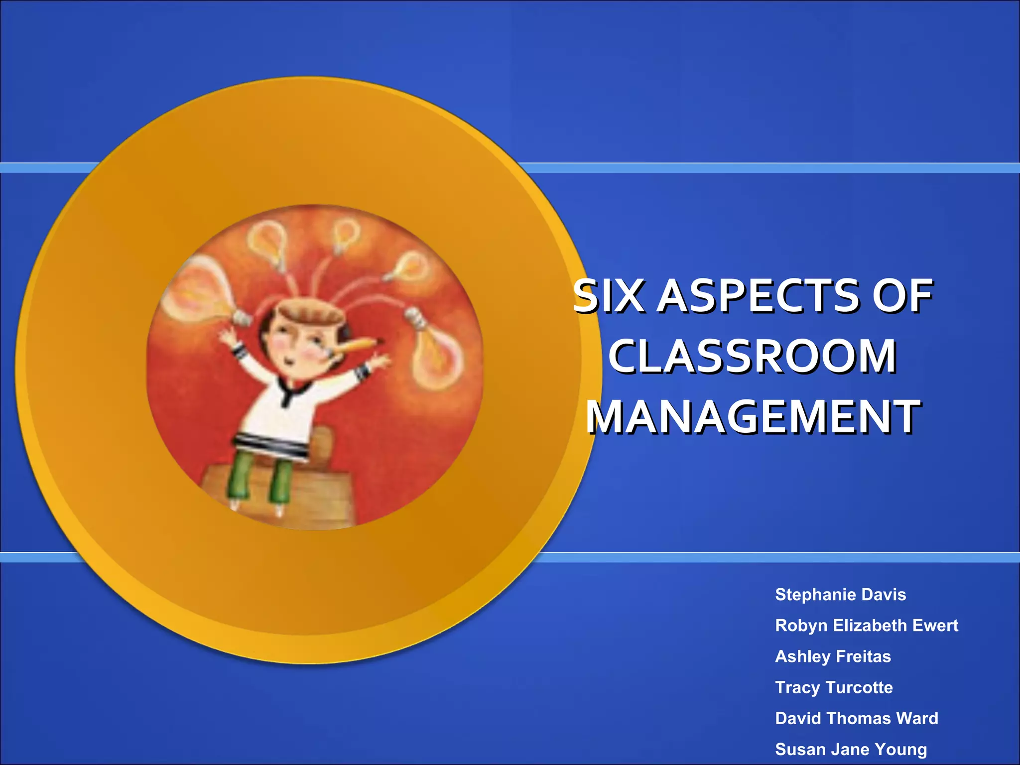 The document discusses six aspects of effective classroom management: consequences, motivation, supply teaching, classroom design, classroom routines, and positive recognition. It provides details on establishing clear rules and consequences, types of motivation, preparation and expectations for supply teaching, using classroom design to enhance management, implementing consistent routines, and employing group positive reinforcement strategies.