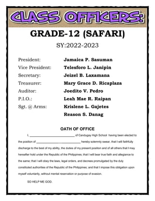 The document contains the oath of office for two student organizations - Grade 11 (Philia) and Grade 12 (Safari) - at Candugay High School for the 2022-2023 school year. It lists the elected officers for each group and the oath that the officers will take to faithfully discharge their duties, bear true faith and allegiance to the Philippines, and obey its laws and decrees.