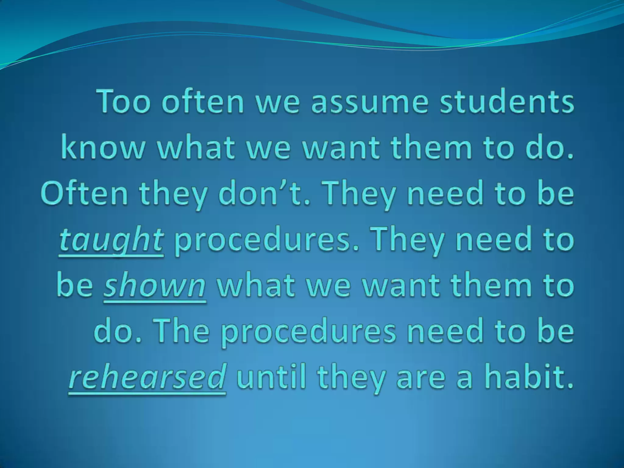 The document lists numerous procedures that a teacher needs to establish for their classroom related to student behavior and technology use. These include procedures for entering and exiting the classroom, getting into groups, responding to announcements, using laptops and what to do if they malfunction, going to the bathroom, and packing up at the end of class. The teacher is asked to share these procedures with groups and get feedback on negative learning behaviors observed and procedures that could address them.