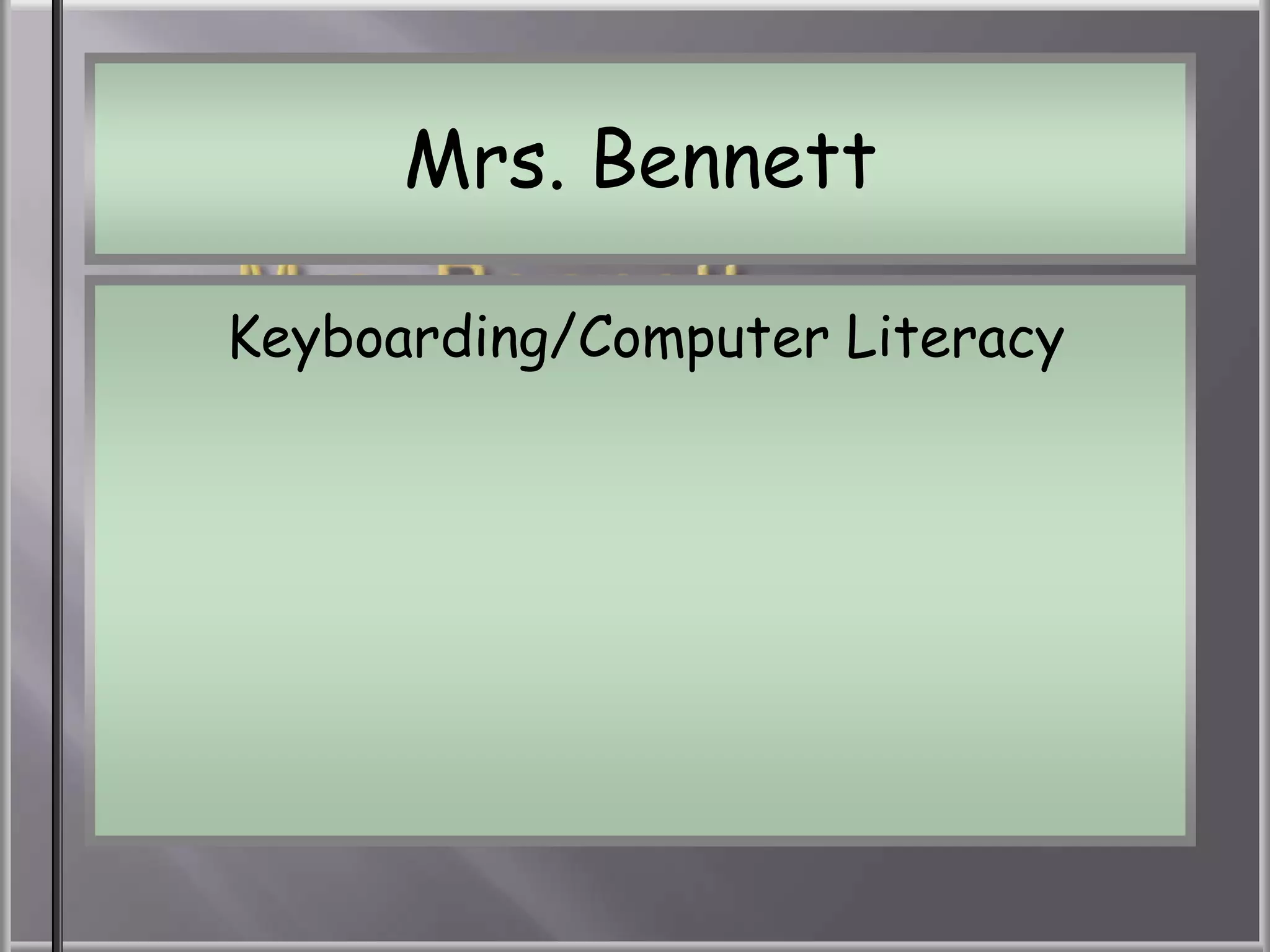 This document contains the classroom rules and syllabus for a keyboarding and computer literacy class. It outlines expectations for student behavior, assignments, and use of technology. Key points include: students must be ready when the bell rings or will be marked tardy; disruptive behavior like cheating or swearing will result in detention; all work must be saved to student folders on the server; and makeup work must be completed within 2 days or receives a zero. The goal is for students to learn keyboarding skills, Microsoft Office programs, web design, and file management on both Windows and Mac computers.
