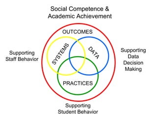 The document discusses implementing schoolwide positive behavior support (PBS) at the classroom level. It outlines eight essential classroom features for PBS: clearly defining and teaching classroom expectations/rules; establishing and teaching classroom routines/procedures; providing high rates of positive feedback; using respectful redirection for errors; actively supervising students; giving multiple opportunities for students to respond; offering choice and varying activities; and ensuring academic success through appropriately leveled tasks. It provides examples and assessment criteria for schools to implement each feature with fidelity across all classrooms to improve social/behavioral outcomes and academic achievement.
