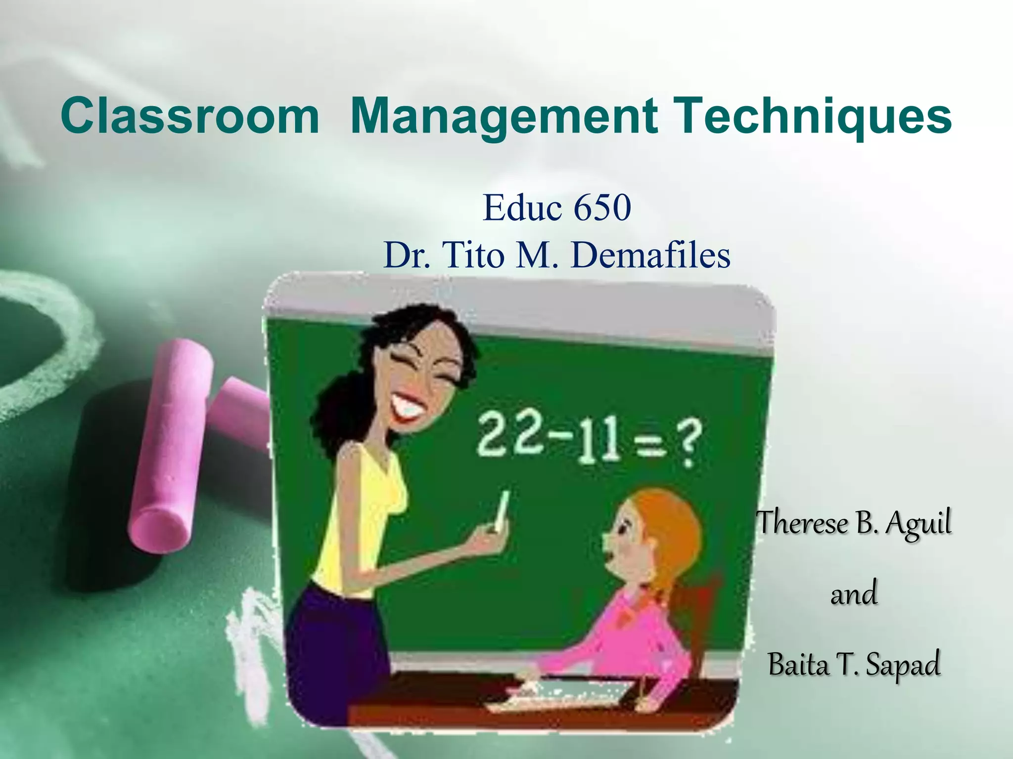The document discusses various aspects of classroom management techniques. It covers establishing classroom rules and procedures, which typically fall into categories like general behavior expectations, beginning and ending the day, transitions, materials/equipment, group work, and teacher-led activities. It emphasizes the importance of involving students in designing the rules. The document also discusses disciplinary interventions, which should include a balance of positive and negative consequences applied through techniques like teacher reaction, tangible recognition, direct cost, group contingency, and home contingency. Clear behavioral limits and record keeping are also important.