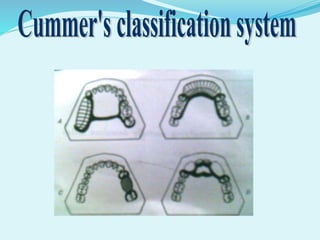 The document discusses the history and development of various classification systems for partially dentulous arches. It describes over a dozen systems proposed between 1905-1960, including those by Kennedy, Cummer, Bailyn, Mauk, Beckett, Friedman, Austin-Lidge, Skinner, and Applegate-Kennedy. The Applegate-Kennedy system, which is a modification of Kennedy's original system, is highlighted as being the most universally used today for its simplicity.