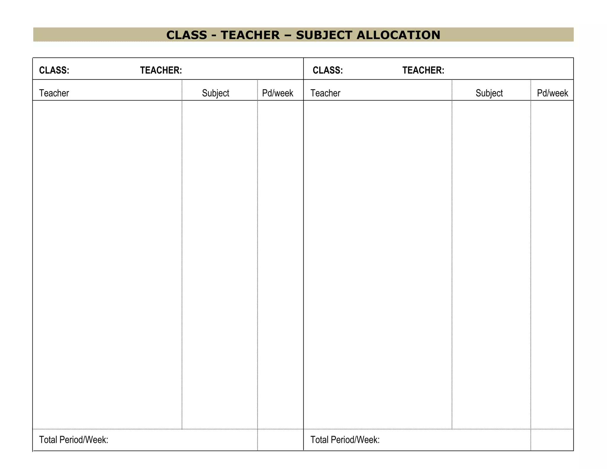 This document allocates teachers and subjects to different classes. It lists the teacher, subject, and number of periods per week for each class. The total number of periods per week is also provided for each class.