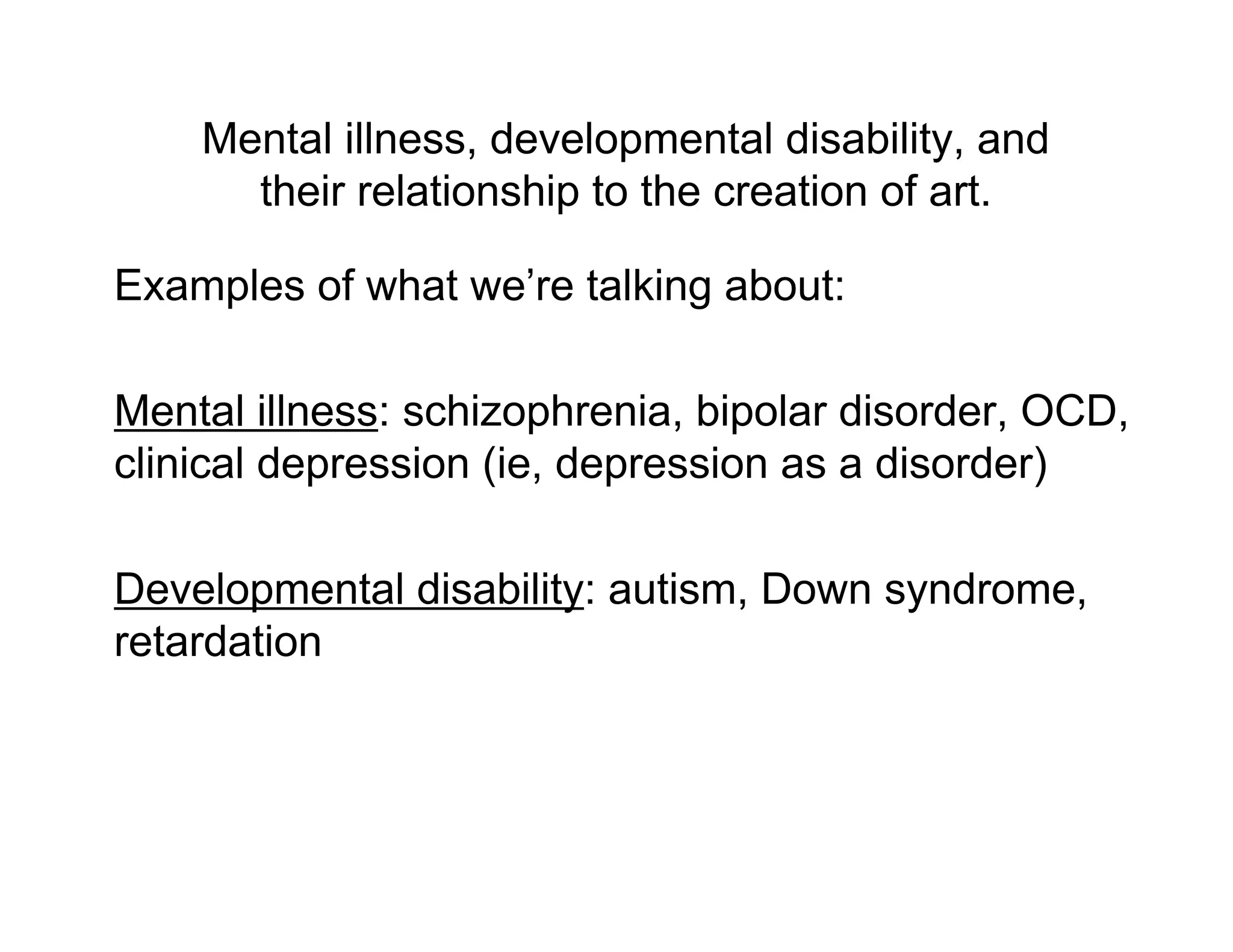 This document discusses the relationship between mental illness, developmental disability, and art creation. It provides examples of mental illnesses like schizophrenia and developmental disabilities like autism. It then discusses the history of how these conditions were viewed and treated, from being seen as evil or diseased in the 1700s-1800s, to the rise of institutions in the 1800s. The document also explores several artists who created art while suffering from mental illnesses or developmental disabilities, examining trends in their work like obsessiveness, distortion, and use of text/language. It considers how knowledge of an artist's condition may influence the interpretation of their art.