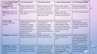 This rubric outlines the criteria and standards for classwork and homework assignments, which make up 20% of the overall grade. For classwork, students will be evaluated on their amount of work, ability to illustrate problems, understanding of topics, calculation skills, and explanations. For homework, students will be evaluated on completion of work, illustration of step-by-step work, understanding demonstrated through vocabulary and strategies, accuracy of calculations, and ability to explain their process and work. Performance is scored on a scale of 1 to 4, with 4 being exceeds standards and 1 being does not meet standards.