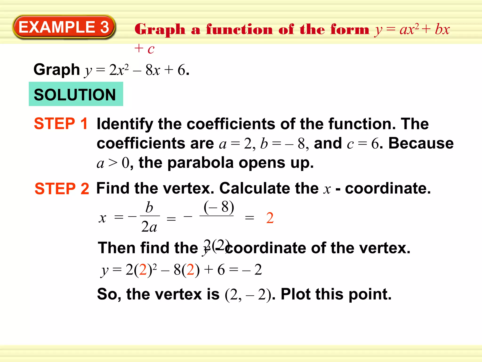 This document provides steps to graph functions of the form y = ax^2 + bx + c. It works through an example problem, graphing y = 2x^2 - 8x + 6. The steps are to: 1) identify the coefficients a, b, and c, 2) find the vertex by calculating x from b/2a and the corresponding y-value, 3) draw the axis of symmetry at x, 4) plot other points and 5) draw the parabola through the points. It then provides guided practice problems for students to practice graphing quadratic functions using the same steps.
