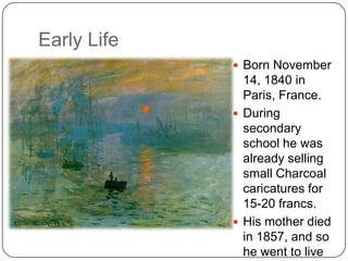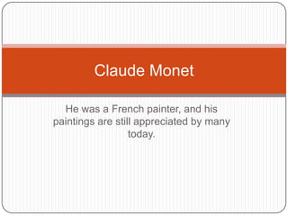 Claude Monet was a famous French impressionist painter born in 1840 in Paris. He was one of the founders of the impressionist movement and was known for his plein air landscape paintings. Monet struggled financially during his lifetime but his works grew in popularity after his death in 1926. He spent his career dedicated to painting outdoor scenery and is still appreciated today for his contributions to impressionist art.
