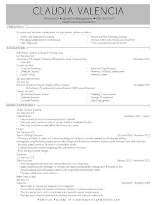 Claudia Valencia has strong leadership and communication skills with experience in marketing, sales, and project management. She has a Bachelor's degree in Marketing from San Jose State University and an Associate's degree in Visual Communication from FIDM. Her work experience includes positions at Global Gourmet Catering, Minted, Nordstrom, and Atelier Salon & Spa where she has demonstrated skills in client services, visual design, and supervising teams.