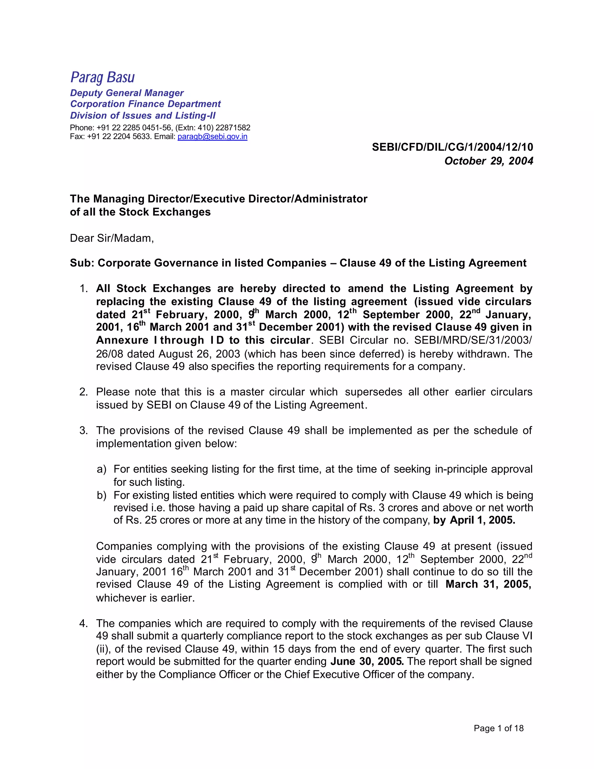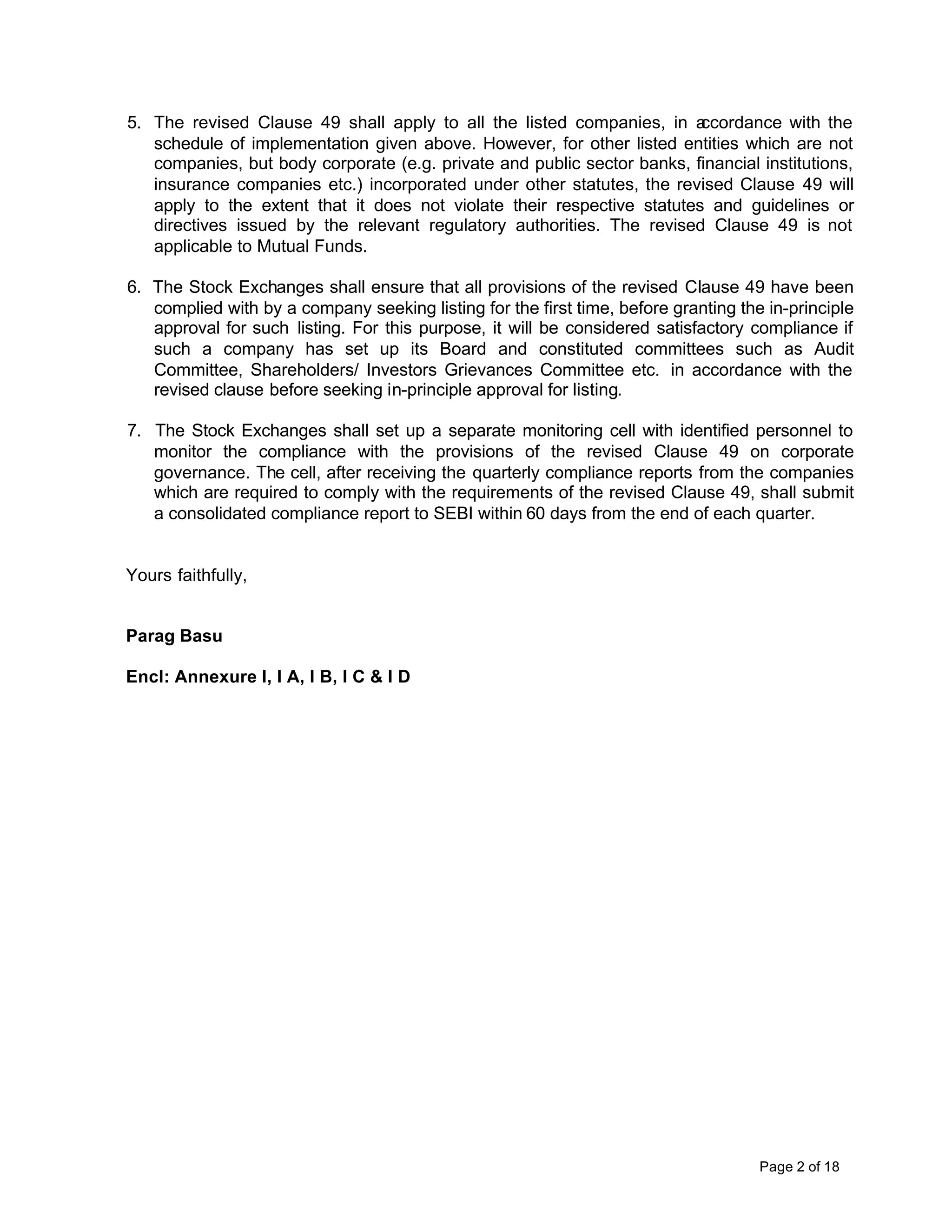 The document is a letter from Parag Basu, Deputy General Manager of SEBI, to the Managing Directors of all stock exchanges in India. It directs the stock exchanges to amend their listing agreements to replace the existing Clause 49 with a revised Clause 49 on corporate governance. It provides details on the implementation schedule and ongoing compliance requirements for listed companies. It also specifies the role of stock exchanges in monitoring compliance and reporting to SEBI.