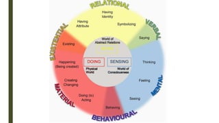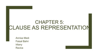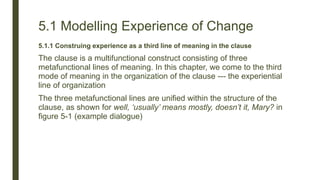 This document discusses how clauses represent experience through three metafunctional lines of meaning: experiential, interpersonal, and textual. It explains how clauses construe relationships between elements through processes like signification. There are different types of processes that provide schemas for construing domains of experience, including material, mental, verbal, existential, relational, and behavioral processes. An example shows how a clause represents the relationship between the token "usually" and its value "mostly" through the process "means".